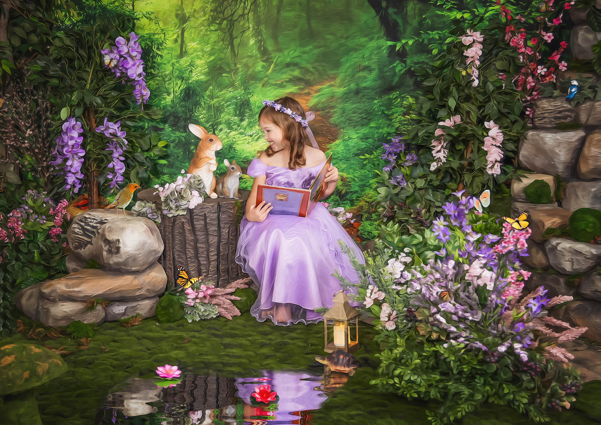 fairytale child portrait girl reading to bunnies in a magic fairy garden